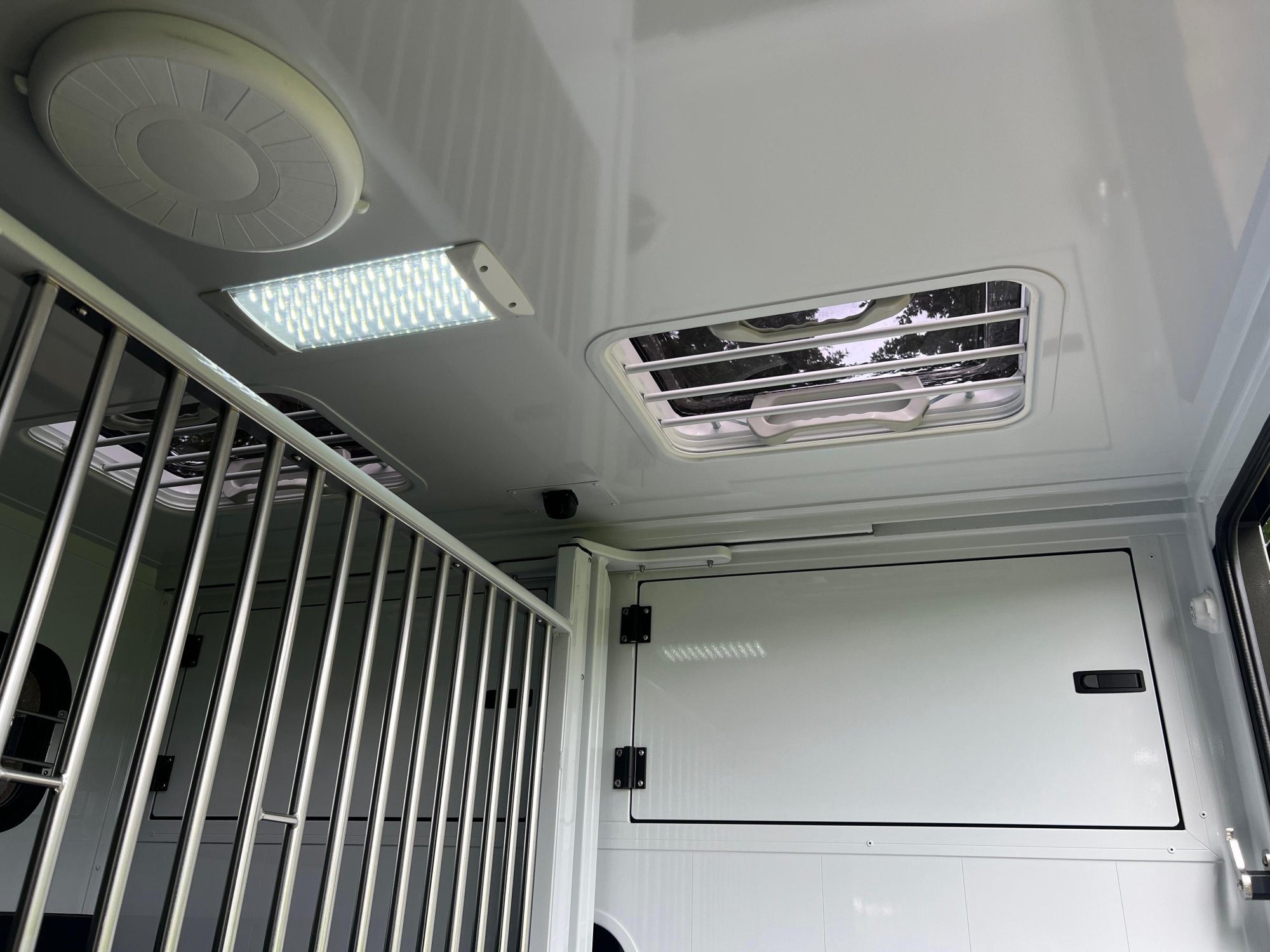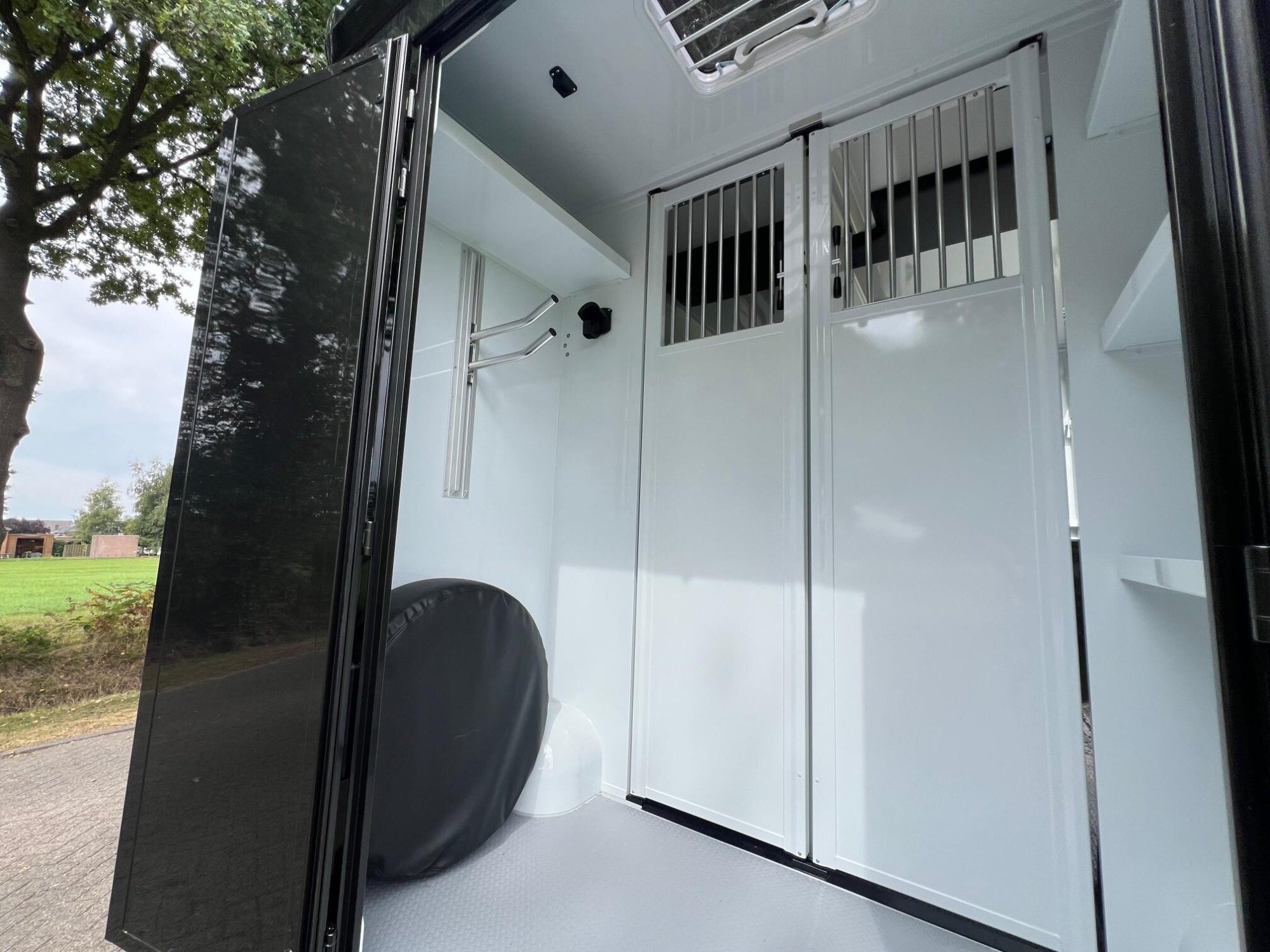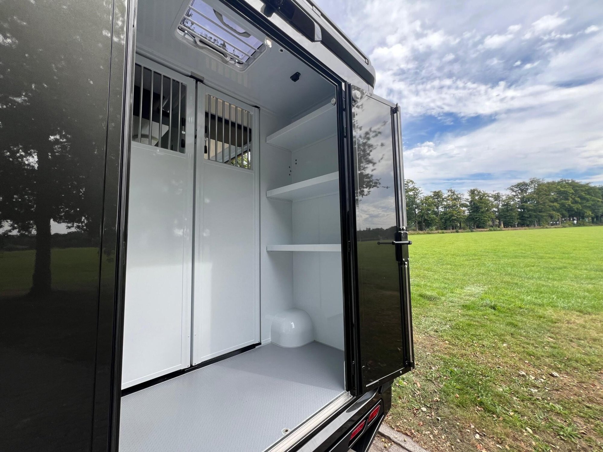 Een uniek voordeel van dit model zijn de dubbele achterdeuren, ideaal bij gebruik van een trailer of op plaatsen waar extra ruimte nodig is. Ook aan opbergruimte is gedacht: meerdere slimme opbergvakken zorgen ervoor dat je alle benodigdheden zoals halsters, dekens, voer en verzorgingsmaterialen netjes kunt meenemen.